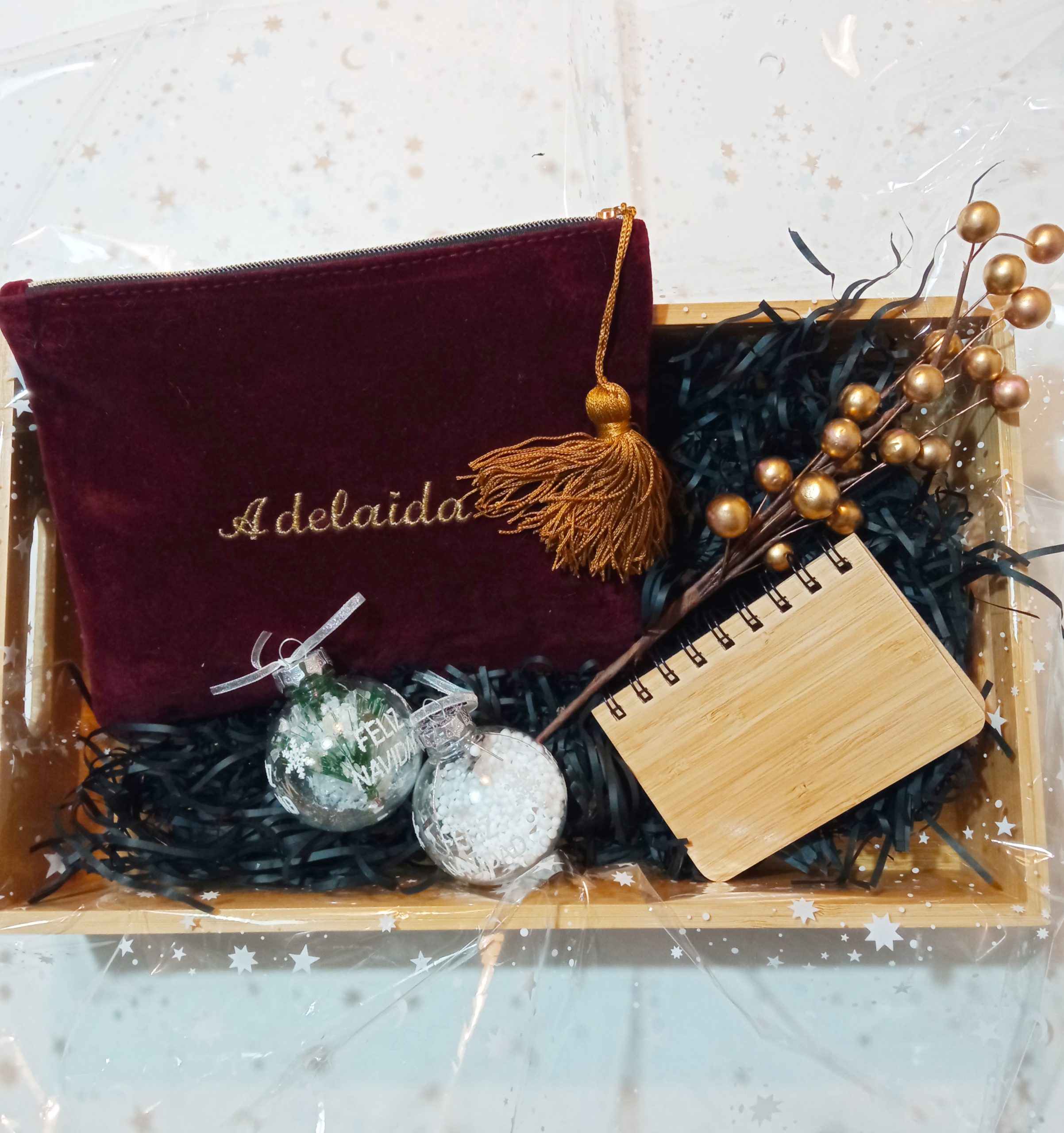Neceser o cartera de mano personalizada con terminación de tejido terciopelado y borlón a juego + libreta con tapas de bambú.