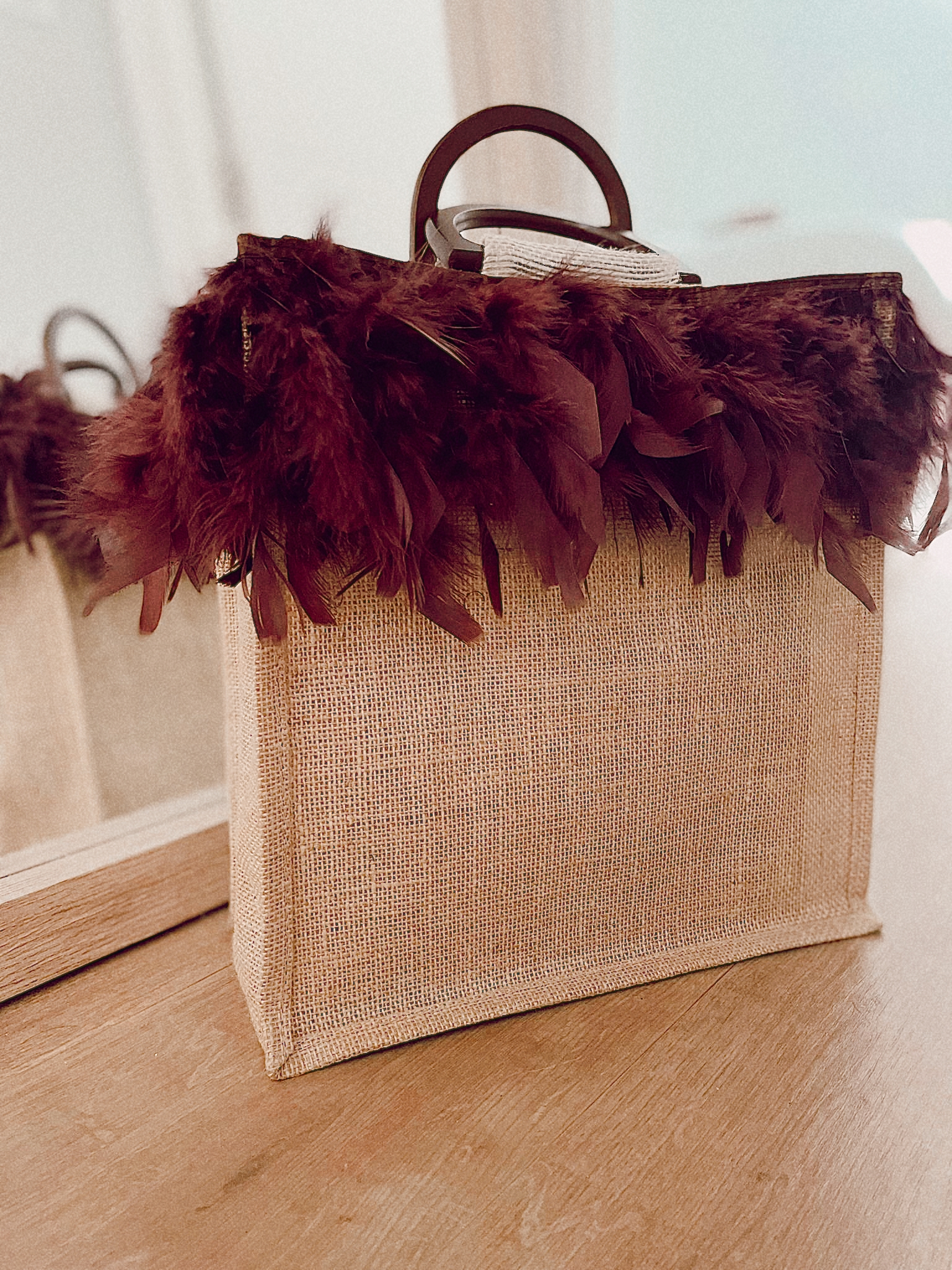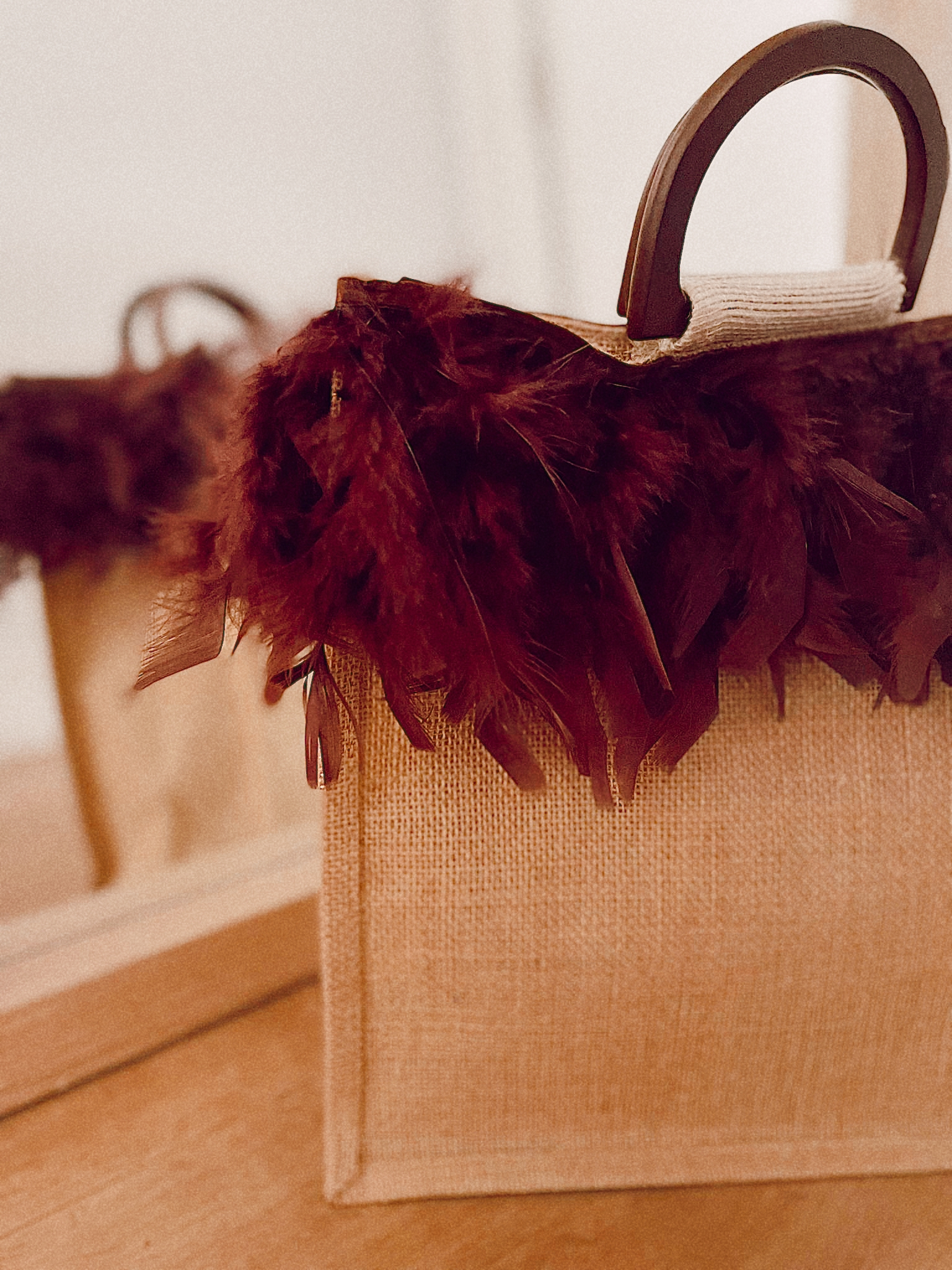 Compuesto de yute y pluma sintética y con un precioso asa de madera, Maxala forma parte de la colección WishBag, nuestros bolsos premium.