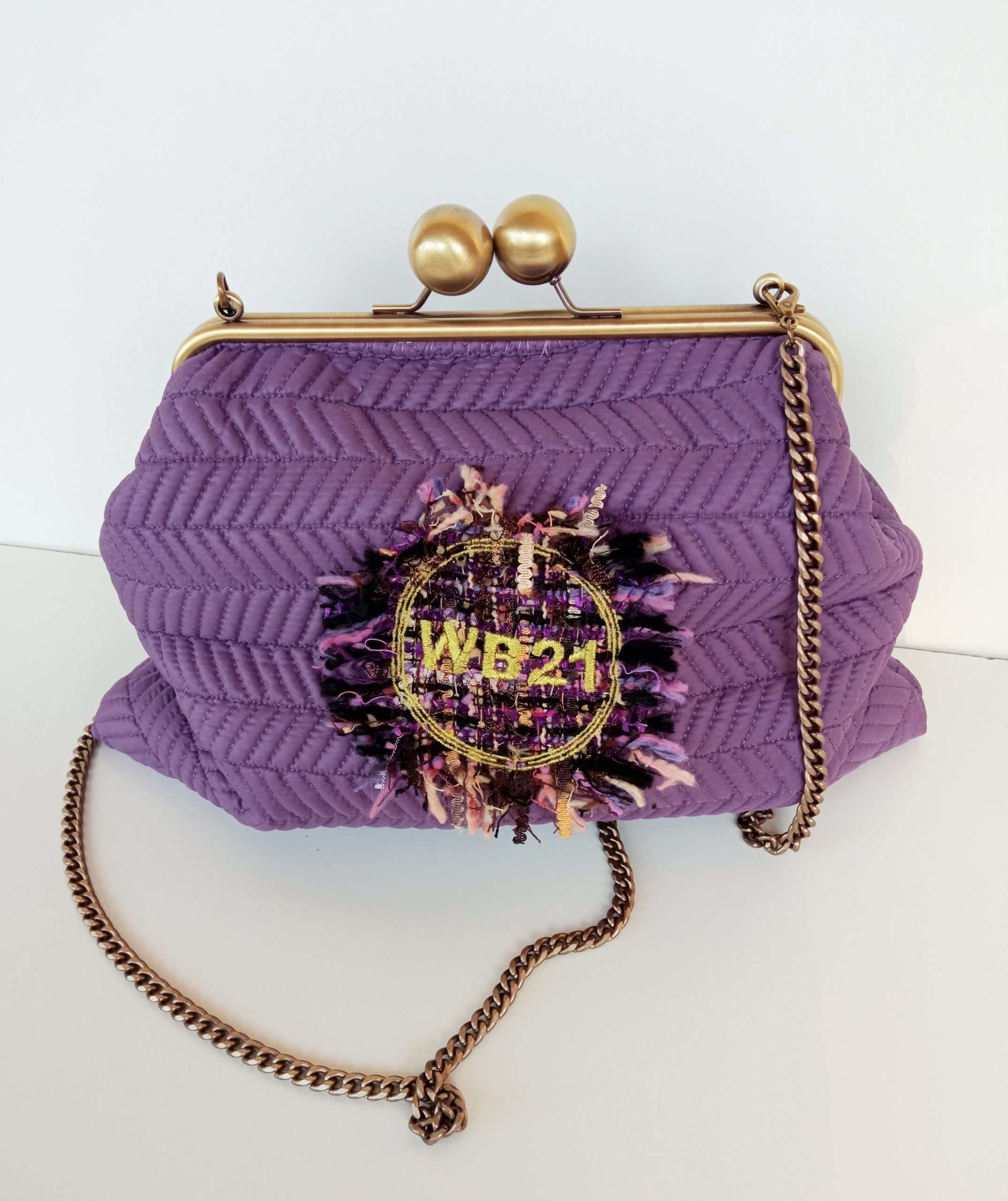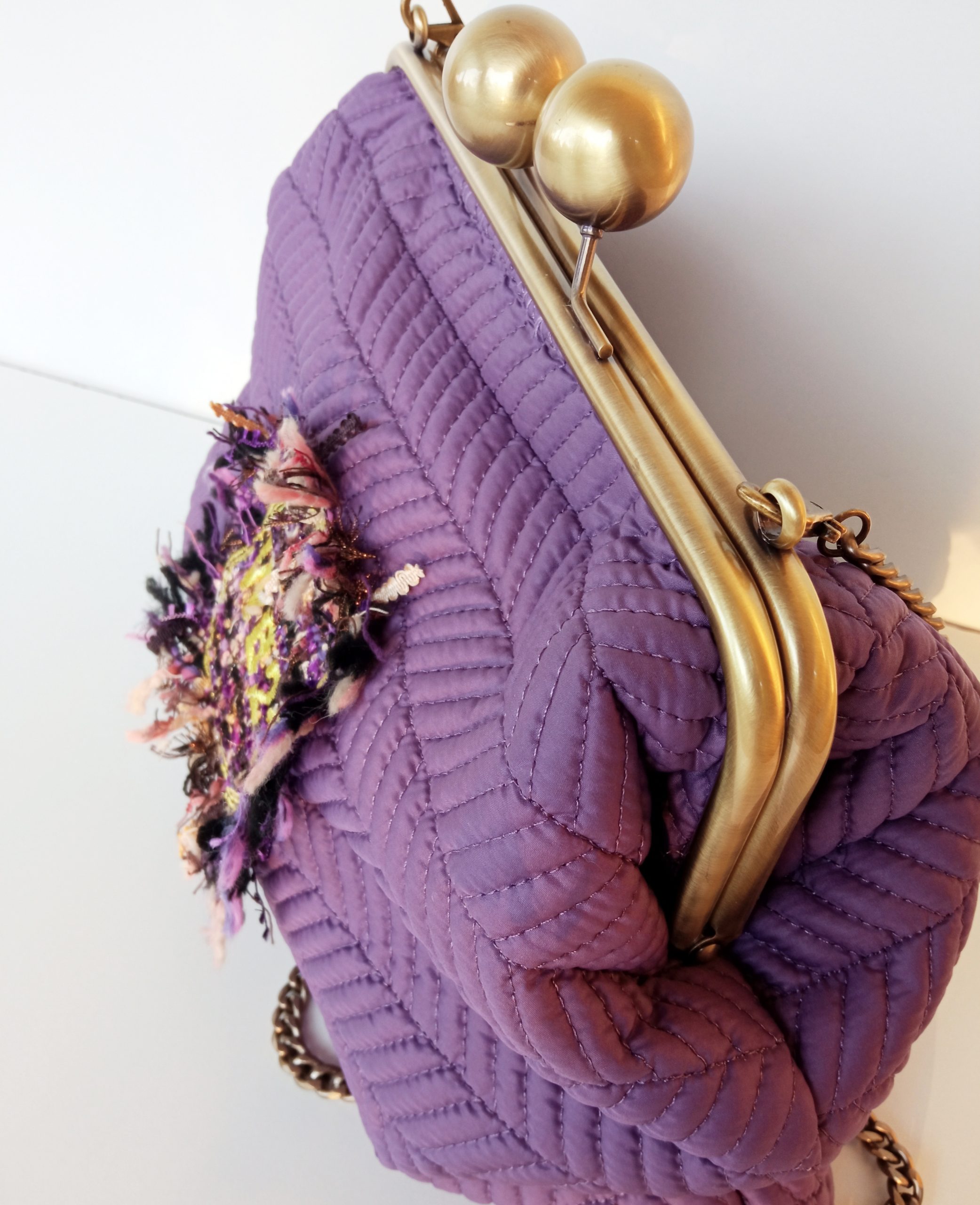 Realizado en tejido acolchado con forro de raso y aplicación bordada .