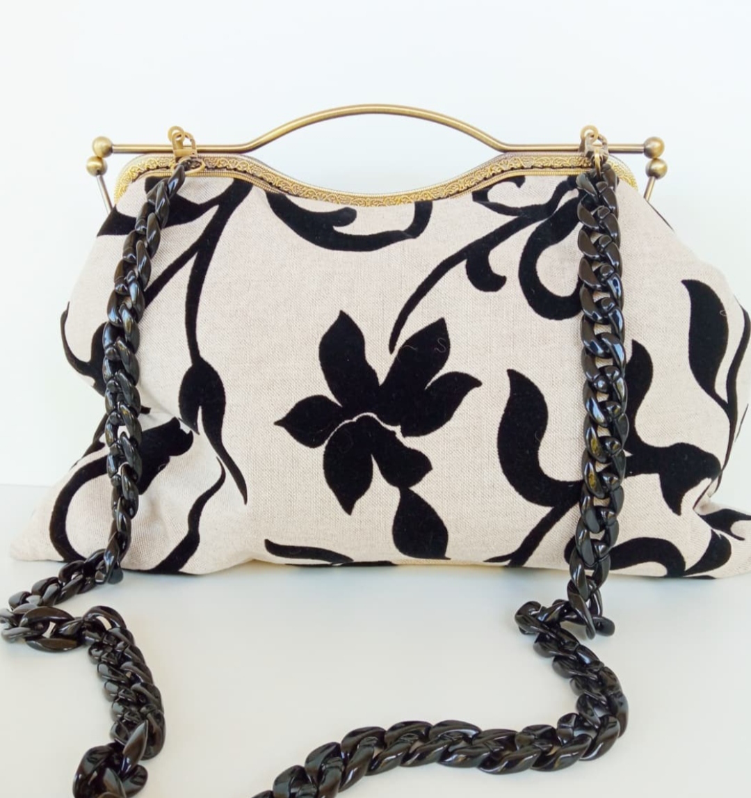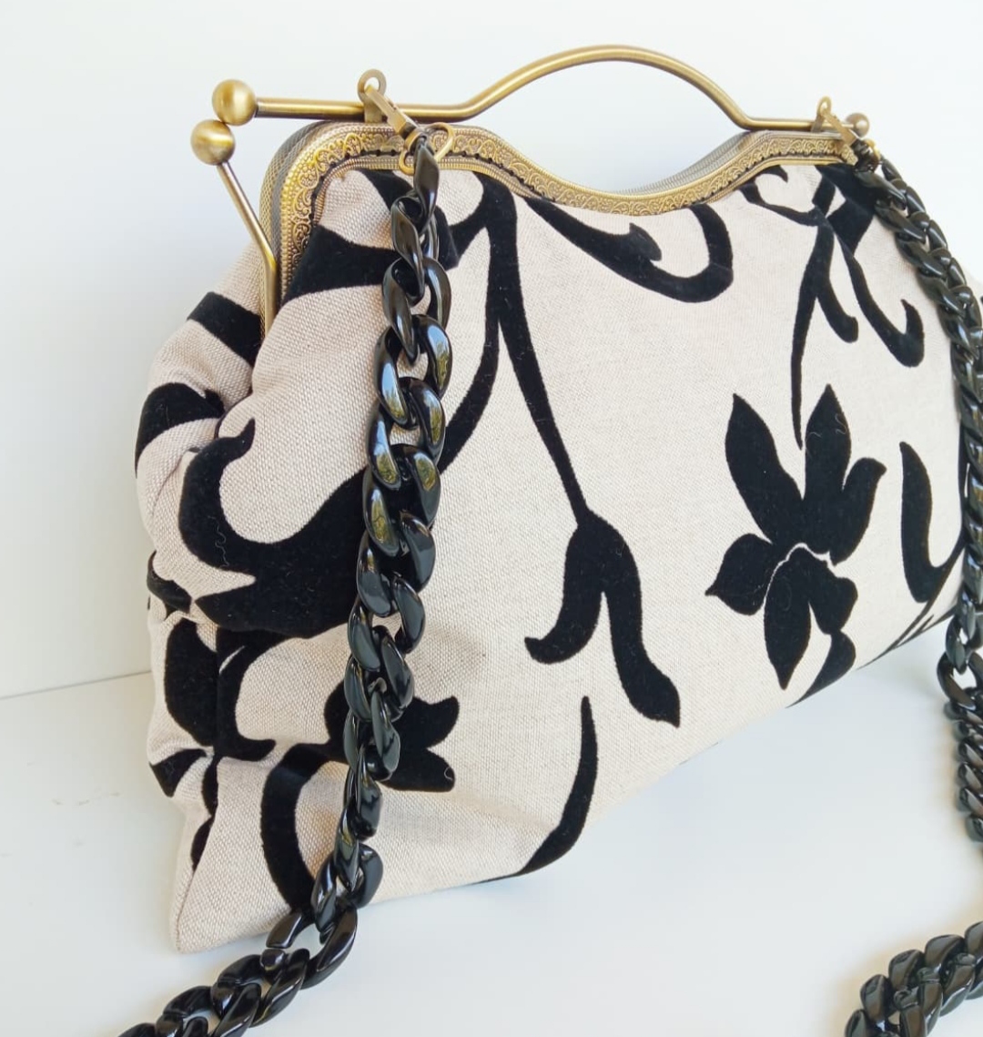 Bolso de loneta estampada y terciopelo. Forro de raso y bolsillo.