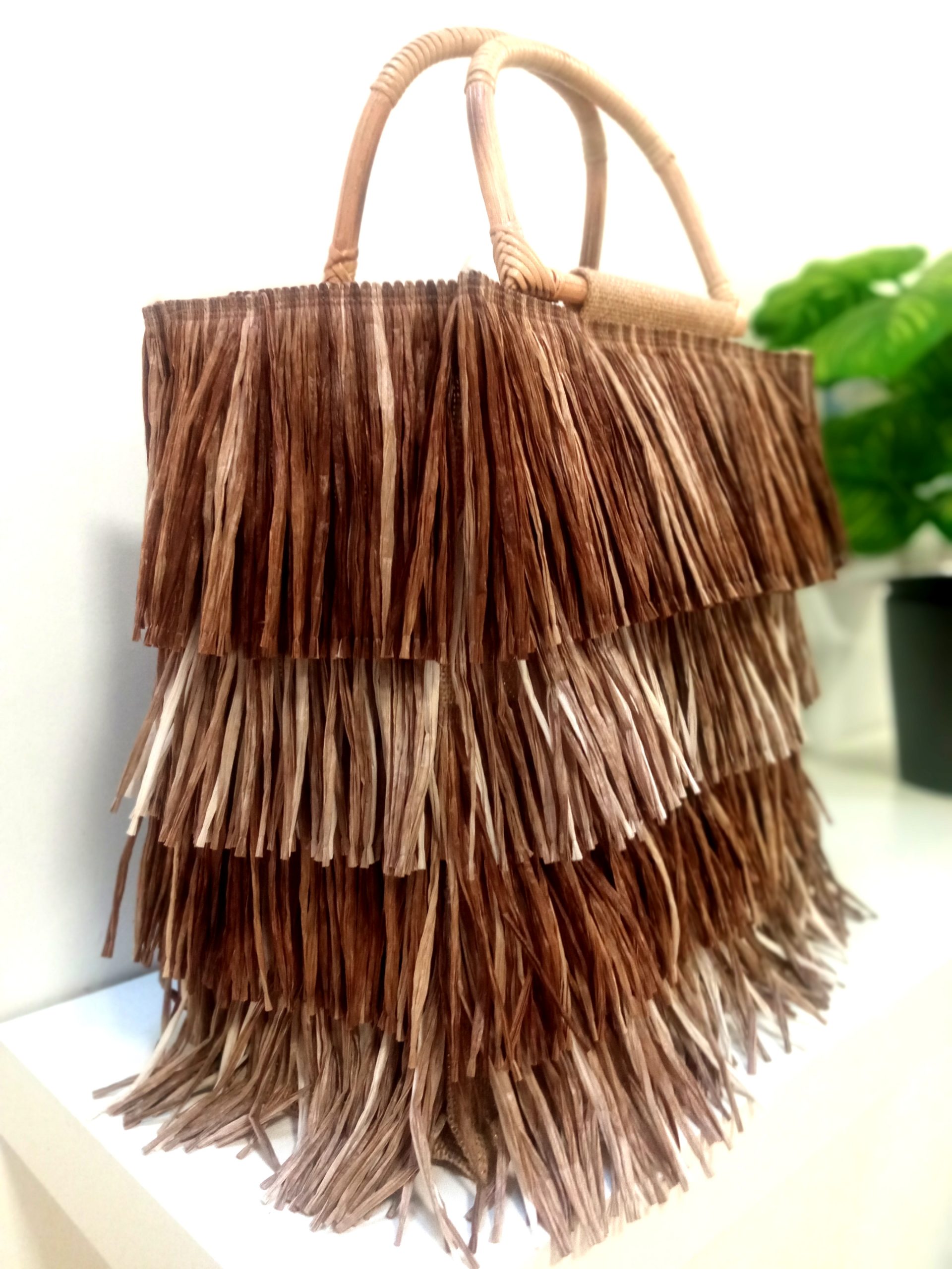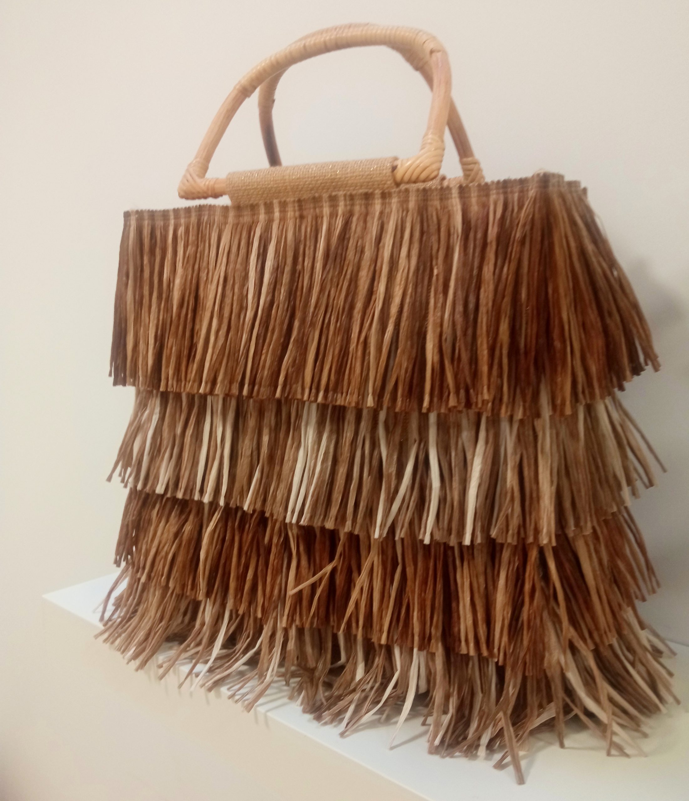 Bolso de flecos de rafia con asas de bambú.