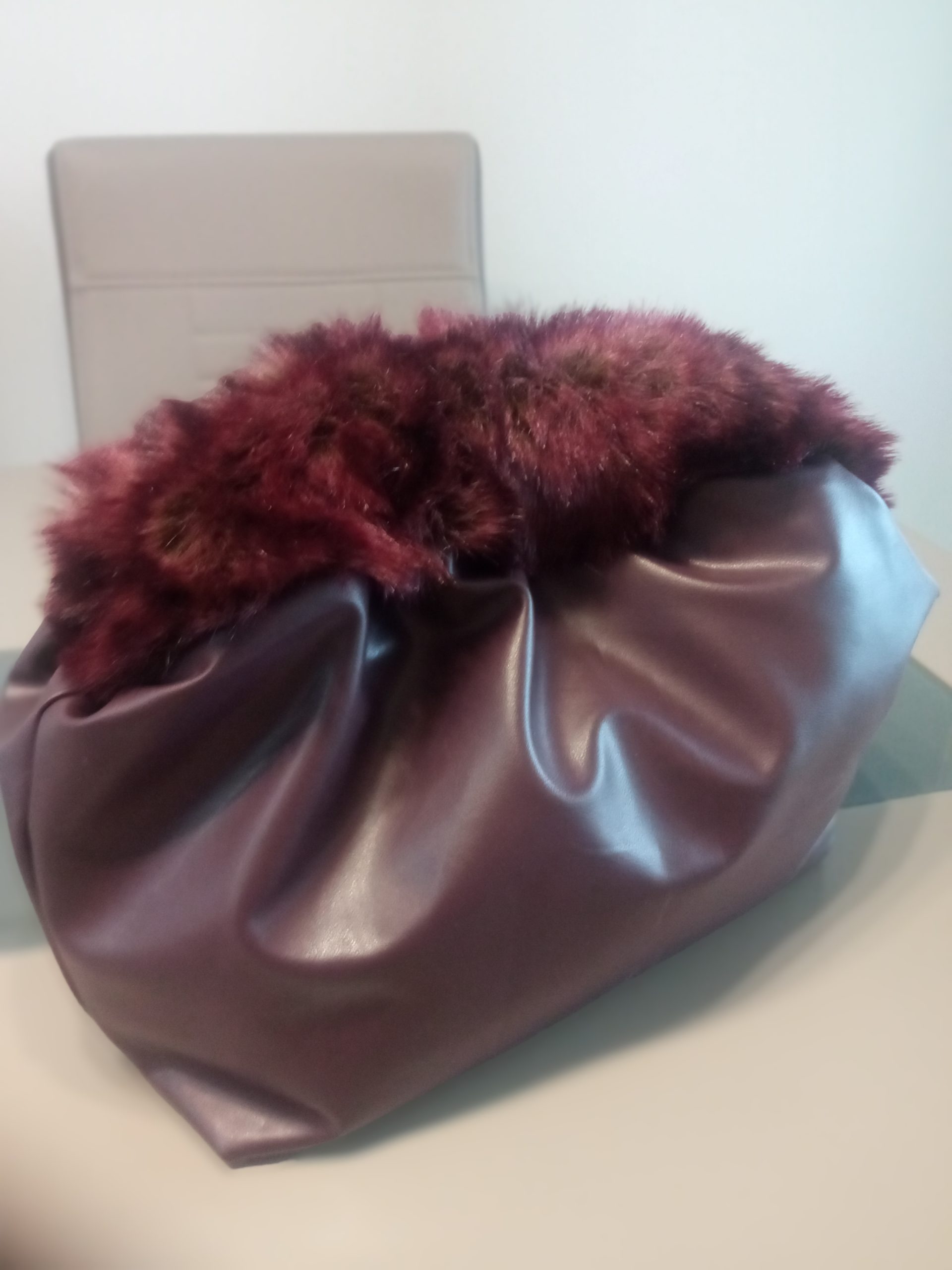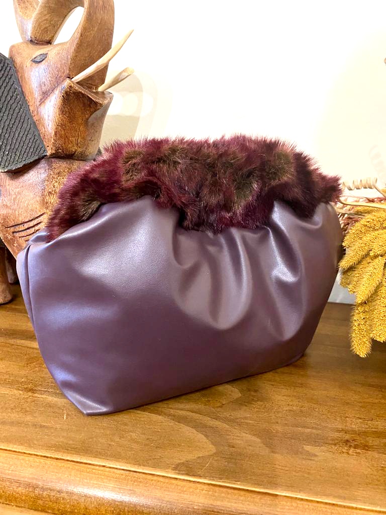 Preciosa cartera de mano bombonera totalmente personalizable en telas y tamaño. Realizada con piel y pelo sintético.