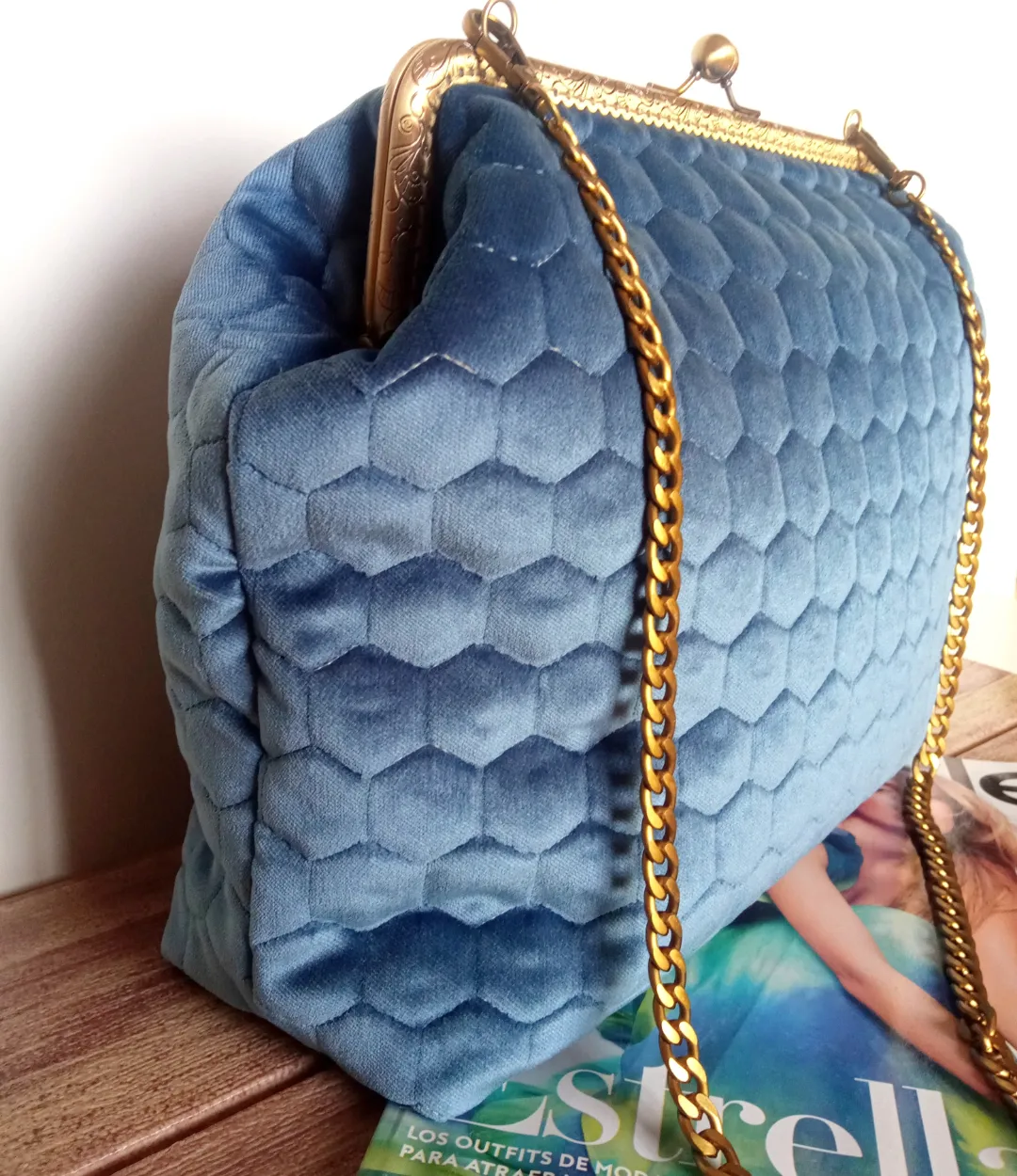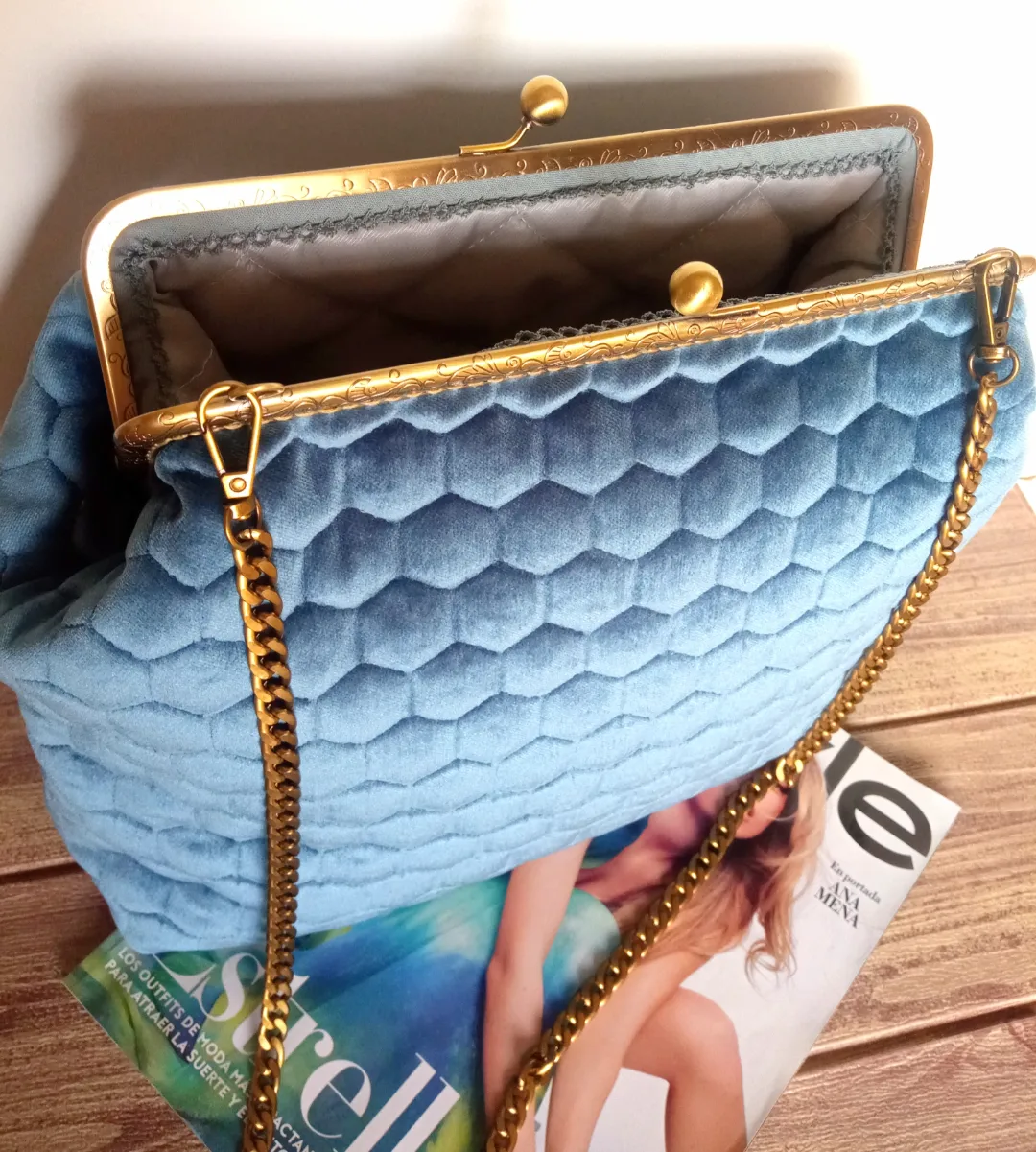 Bolso realizado en tejido acolchado de terciopelo con posibilidad de elegir otro colores . Forrado fantasia y remate decorativo.