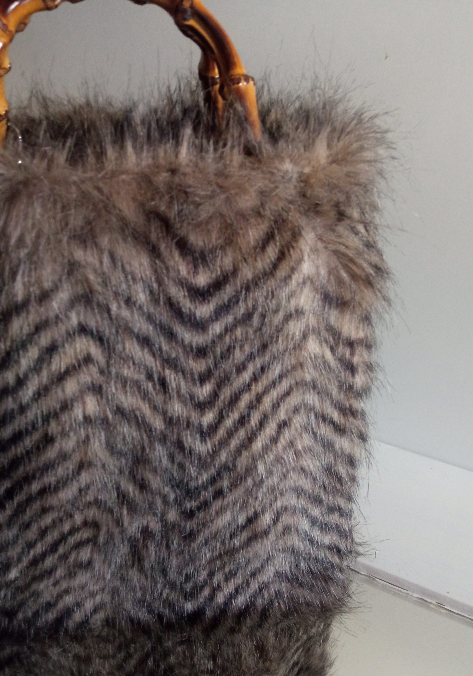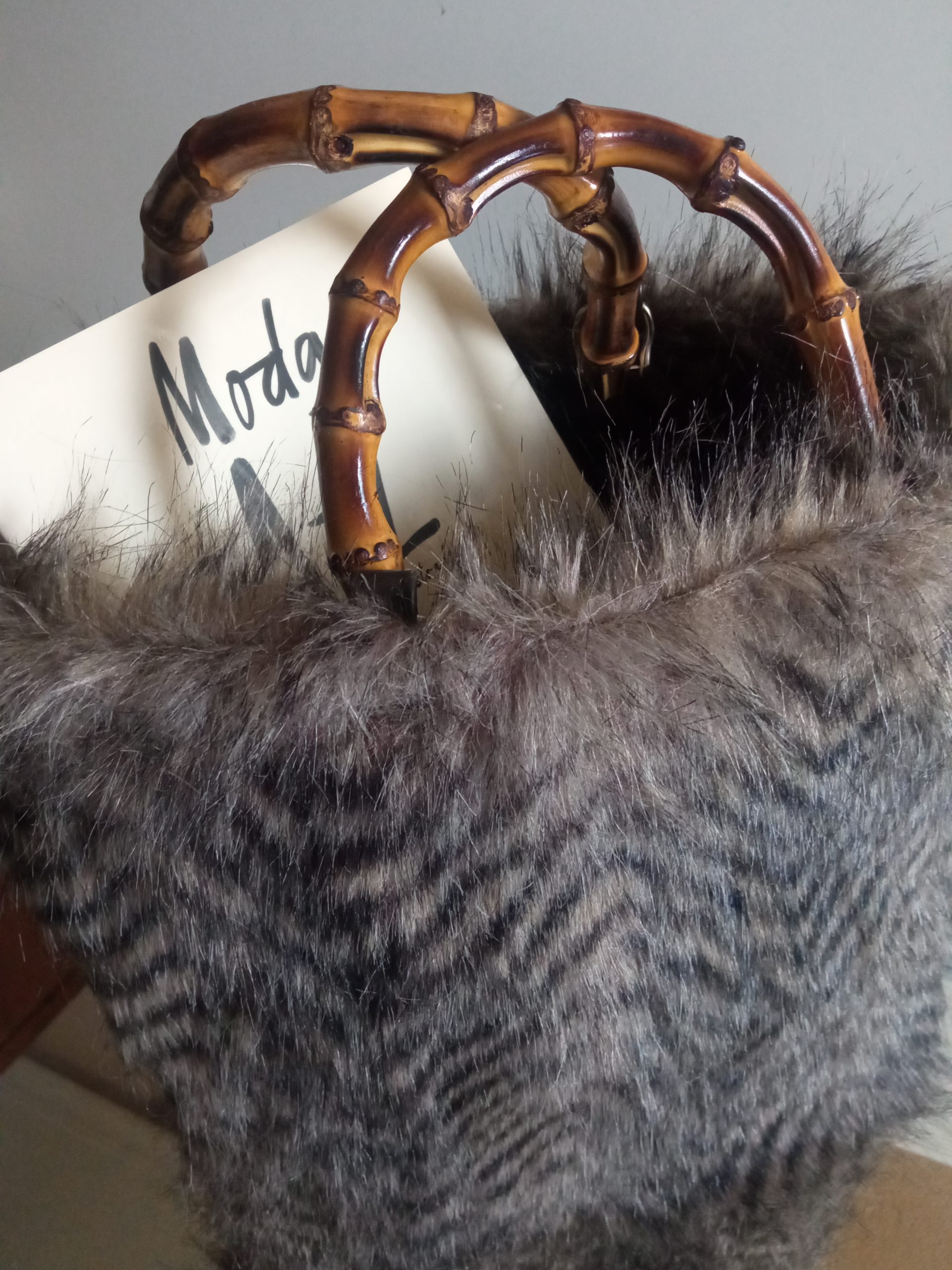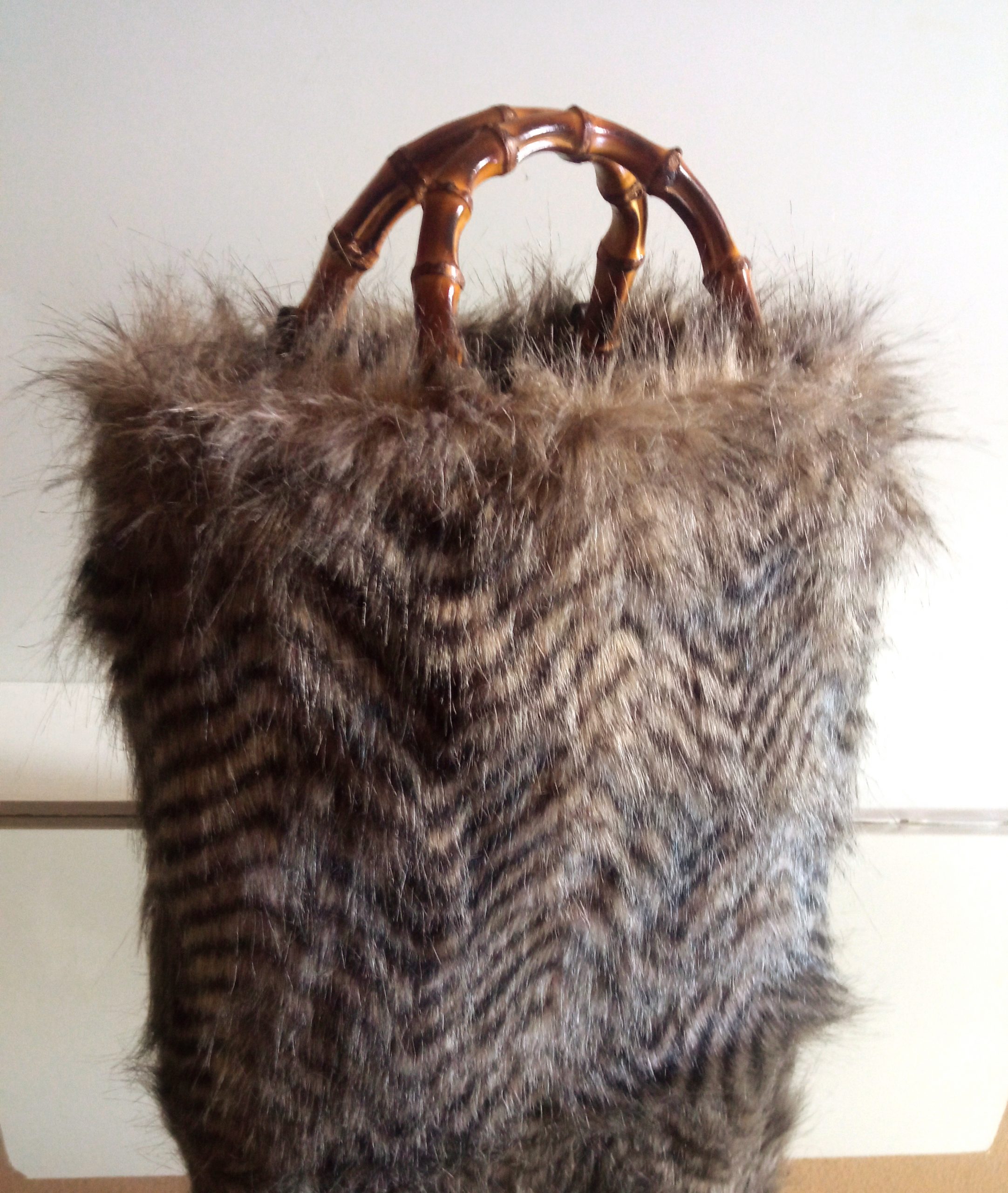 Realizado con pelo sintético bicolor  y asas de bambú.